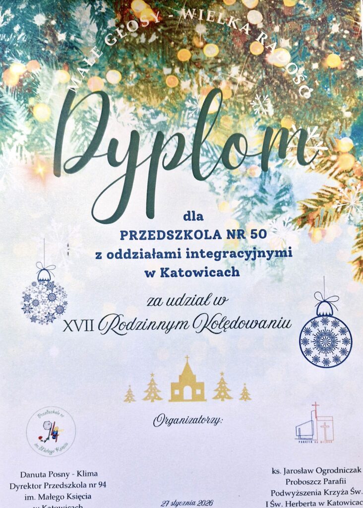 Szanowni Państwo, Kochane Dzieci! Serdecznie dziękujemy za wspólne kolędowanie. Gratulujemy Dzieciom przepięknego występu, a Rodzicom dziękujemy za nieocenione wsparcie i zaangażowanie w przygotowanie. Cieszymy się, że razem mogliśmy stworzyć tak wyjątkową atmosferę.